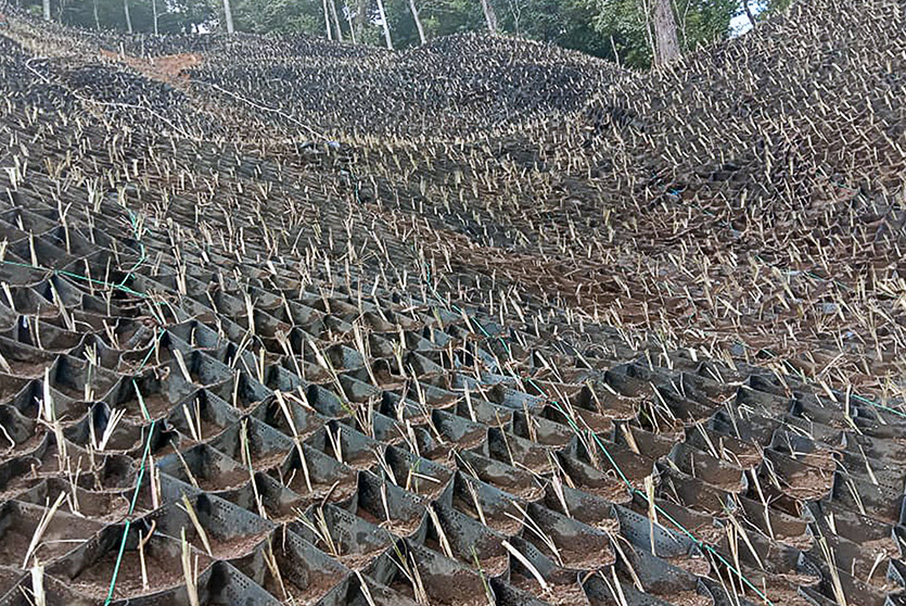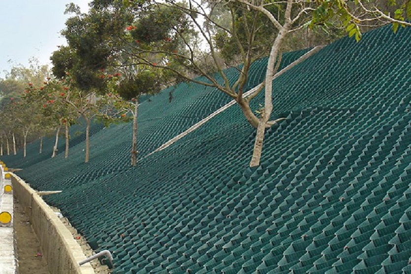 We offer a high-performance, prefabricated 3-dimensional textured geosynthetic protection system made of high-density polyethylene (HDPE) cell webs. The cells are welded at joints to form a cellular soil confinement system. Installing ArmaWeb® is quick and straightforward, and is favorable among engineers and developers for use in a number of landscape applications for transportation, industrial and residential infrastructure projects. Typical applications include:
