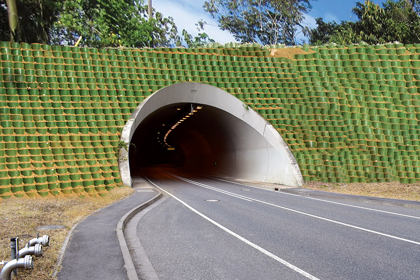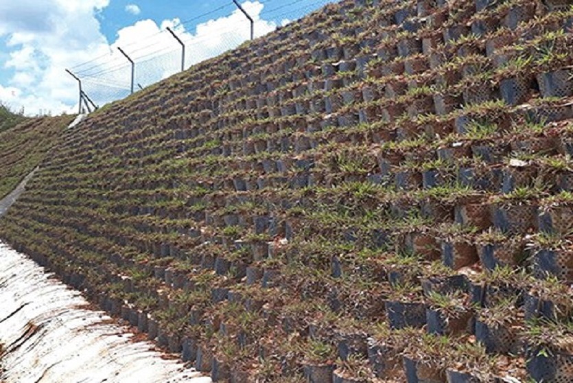 Whether your plans call for a “green” or hardened “grey” surface, your ArmaWeb structure is confirgured with an interlocking matrix of geosynthetic cells that are adaptable to meet environmental, aesthetic and prescribed loading conditions. Stress crack-resistant cells are filled with select aggregates, densified soil, natural flora-growing soils or concrete fill for creating a light or hard-armored landscape structure. Adapting to the countours of the terrain, these structures are suited to stabilize embankments while finished with an attractive sustainable landscape.