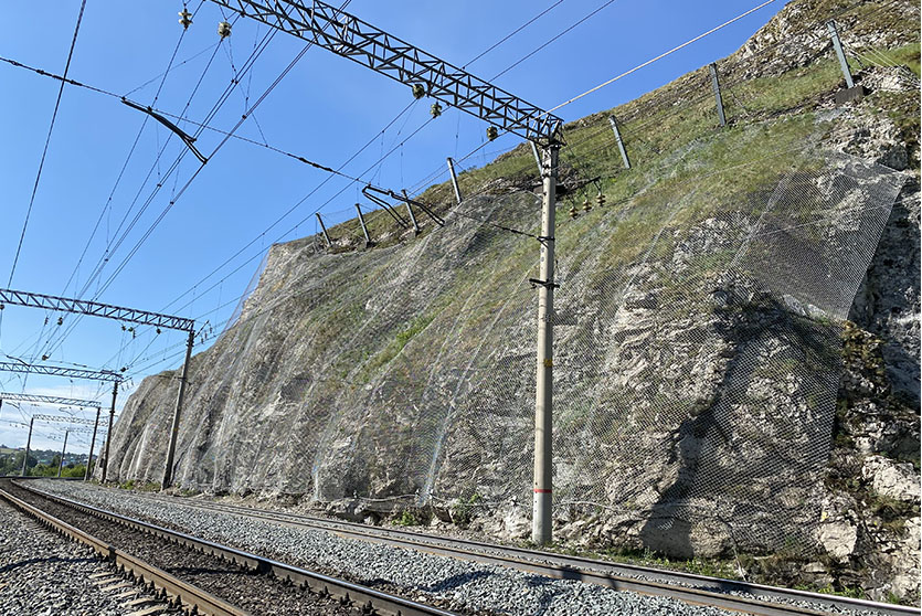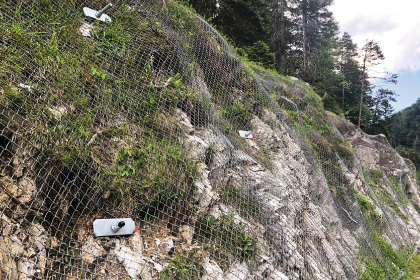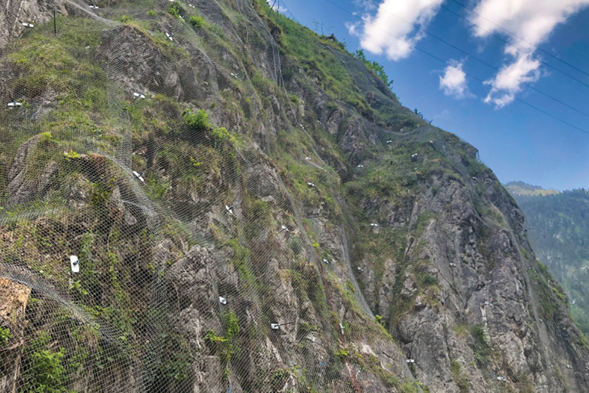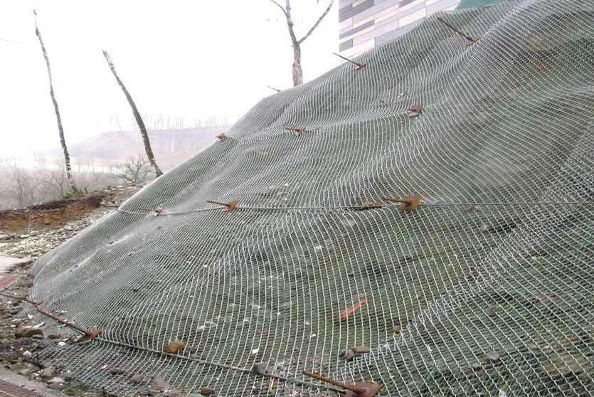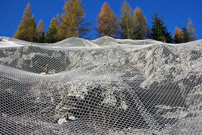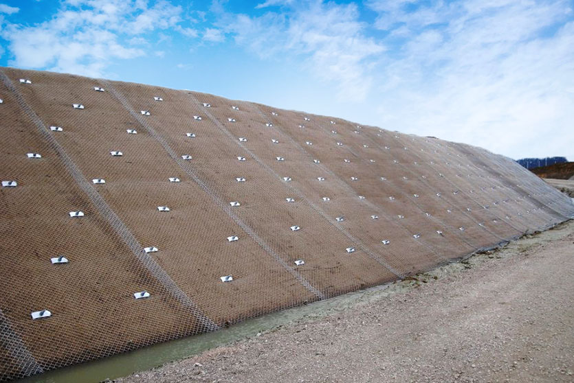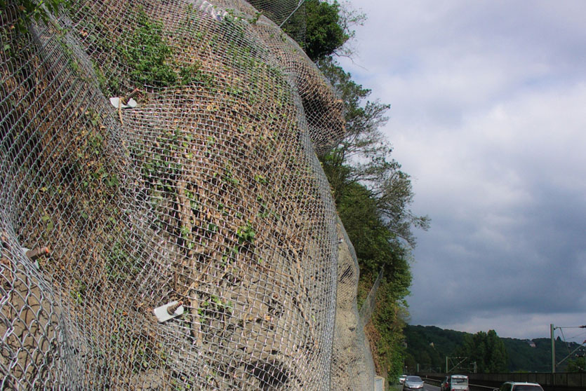 Geoquest Products  offers engineered products for Slope Retention to retain the masses in situ and prevent erosion and shallow landslides. This system is designed on a site-to-site basis. Depending on the site characteristics and strength requirements, a large variety of net and netting products are available. Re-stabilization of the slope using mesh and natural vegetation is highly encouraged. Furthermore, netting can accommodate pre-existing vegetation such as tree trunks with minimal effort.
