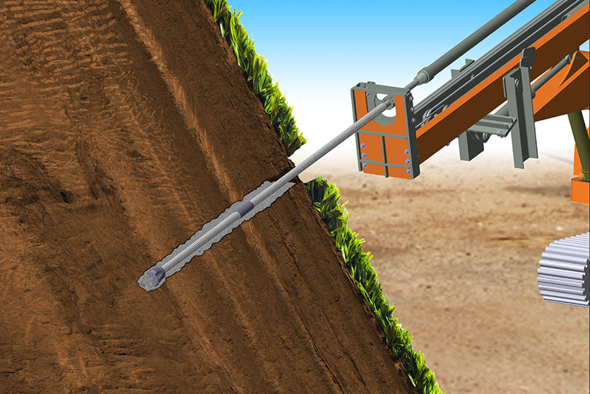 TerraNail is a passive geotechnical anchoring system consisting of a range of bars and adapted accessories, allowing its use in several civil engineering applications. The bars are either fully threaded (Hot threaded) solid bars or rope threaded hollow bars. On-demand, the bars and the accessories can be coated with a corrosion protection system (hot-dip galvanization or epoxy or double corrosion protection with hot-dip galvanization and epoxy). The fundamental concept of TerraNail consists of reinforcing the soil or rock mass by passive inclusions, closely spaced, to create an in-situ coherent gravity structure. Hence, it increases the overall shear strength and stability of the in-situ soil or rock strata and restrains its displacements. Installation of TerraNail for any permanent solution involves basic steps – drilling, placing of the bars, grouting and securing the nail end.